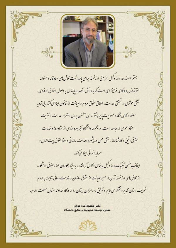 دکتر محمود کلاه دوزان، معاون توسعه مدیریت و منابع دانشگاه، با صدور پیامی به مناسبت فرارسیدن هفتم اسفندماه (روز وکیل)، بر اهمیت جایگاه وکیل و تلاشهای صادقانه آنان برای پاسداری از اصول حرفهای، احقاق حقوق مردم و حمایت از قانون تأکید کرد.