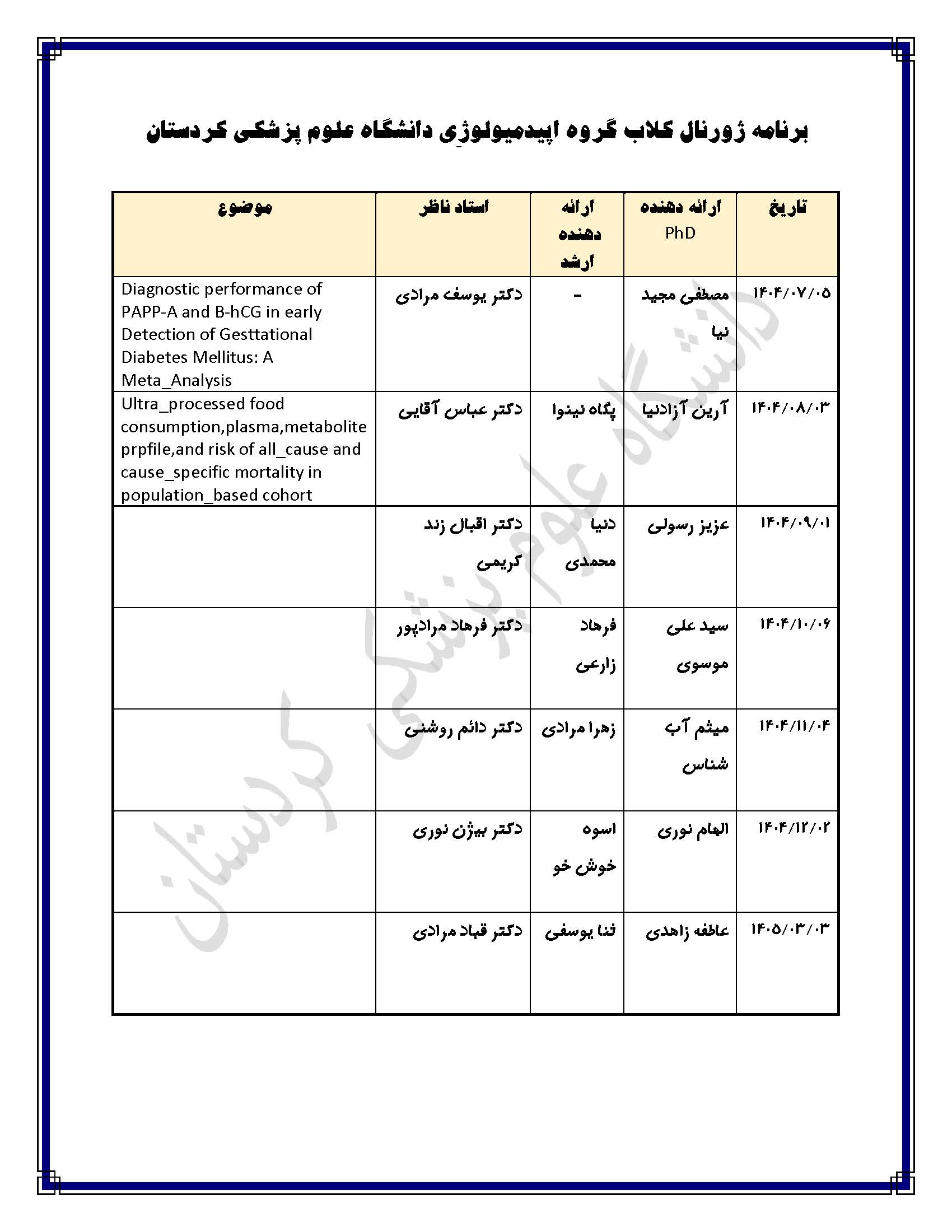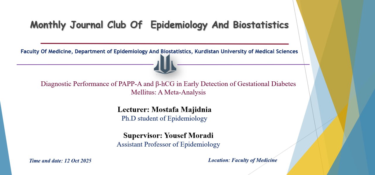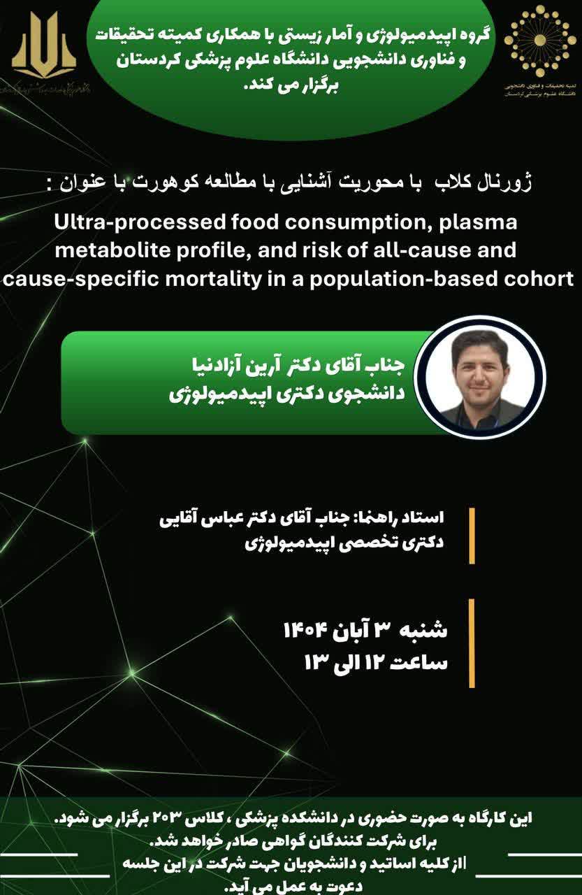 🔍 این ژورنال کلاب تحت عنوان “Ultra_processed food consumption, plasma,metabolite profile,and risk of all_cause and cause_specific mortality in population_based cohort” با تدریس دکتر آرین آزادنیا، دانشجوی دکتری اپیدمیولوژی دانشگاه علوم پزشکی کردستان، و با نظارت دکتر عباس آقایی، دکتری تخصصی اپیدمیولوژی و مدیر گروه اپیدمیولوژی و آمار زیستی دانشگاه، با استقبال گسترده دانشجویان رشتهها و مقاطع مختلف مورخ ۱۴۰۴/۰۸/۰۴ در کلاس ۳۰۲ دانشکده پزشکی برگزار شد.✓ ارائە مقدمەای در ارتباط با مطالعات طولی✓ آشنایی با مبحث غذاهای فوق فراوری شده (UPFs) و تاثیر آن بر ابعاد سلامت✓ بررسی متدولوژی مقاله✓ بررسی پیشفرضها و نکات ضعف و قوت برخی روشها در آنالیز دادهها📃 گواهی حضور شرکتکنندگان در حال آمادهسازی بوده و به محض آماده شدن در اختیار شما عزیزان قرار خواهد گرفت.